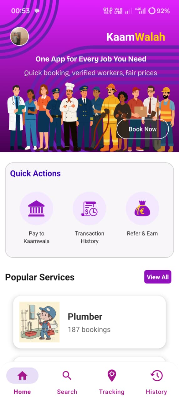 KaamWalah connects you with skilled professionals in your area. Simply download our app, search for the service you need, browse through verified professionals, and book your service in just 60 seconds.